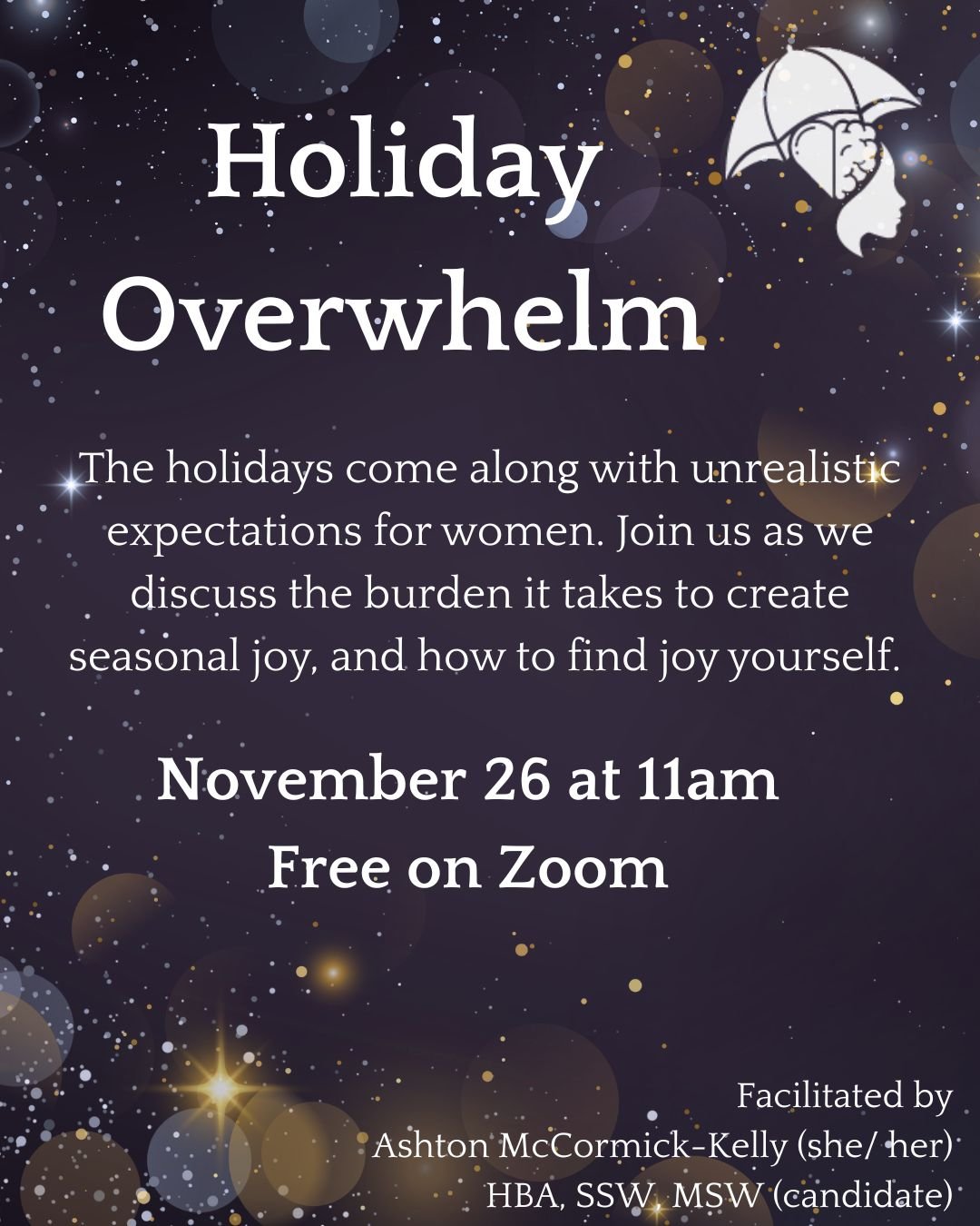 Back to All Events Holiday Overwhelm Wednesday, November 26, 2025 11:00 a.m. 12:00 p.m. Amber Sperling Social Work and Psychotherapy Services 80 Bradford Street, Suite WW15 Barrie, ON, L4N 3B6 Canada (map) Google Calendar ICS